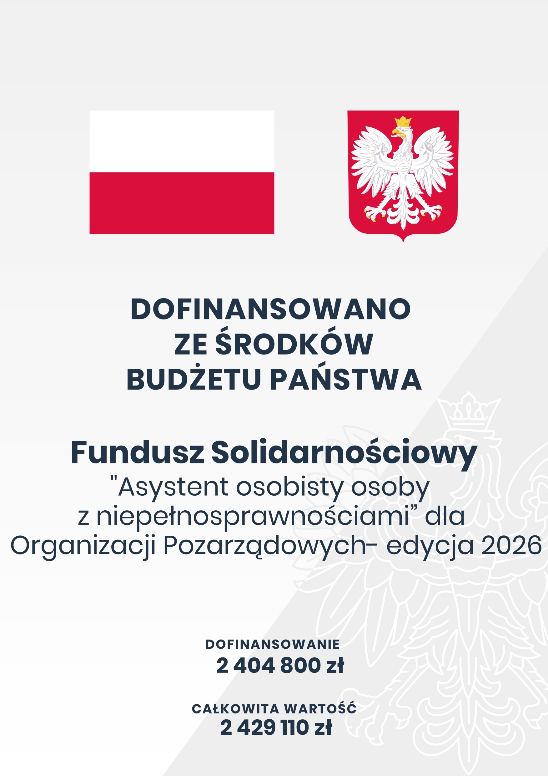 Program „Asystent osobisty osoby z niepełnosprawnościami” dla Organizacji Pozarządowych – edycja 2026 finansowany jest ze środków Funduszu Solidarnościowego w ramach resortowego Programu Ministra Rodziny, Pracy i Polityki Społecznej.